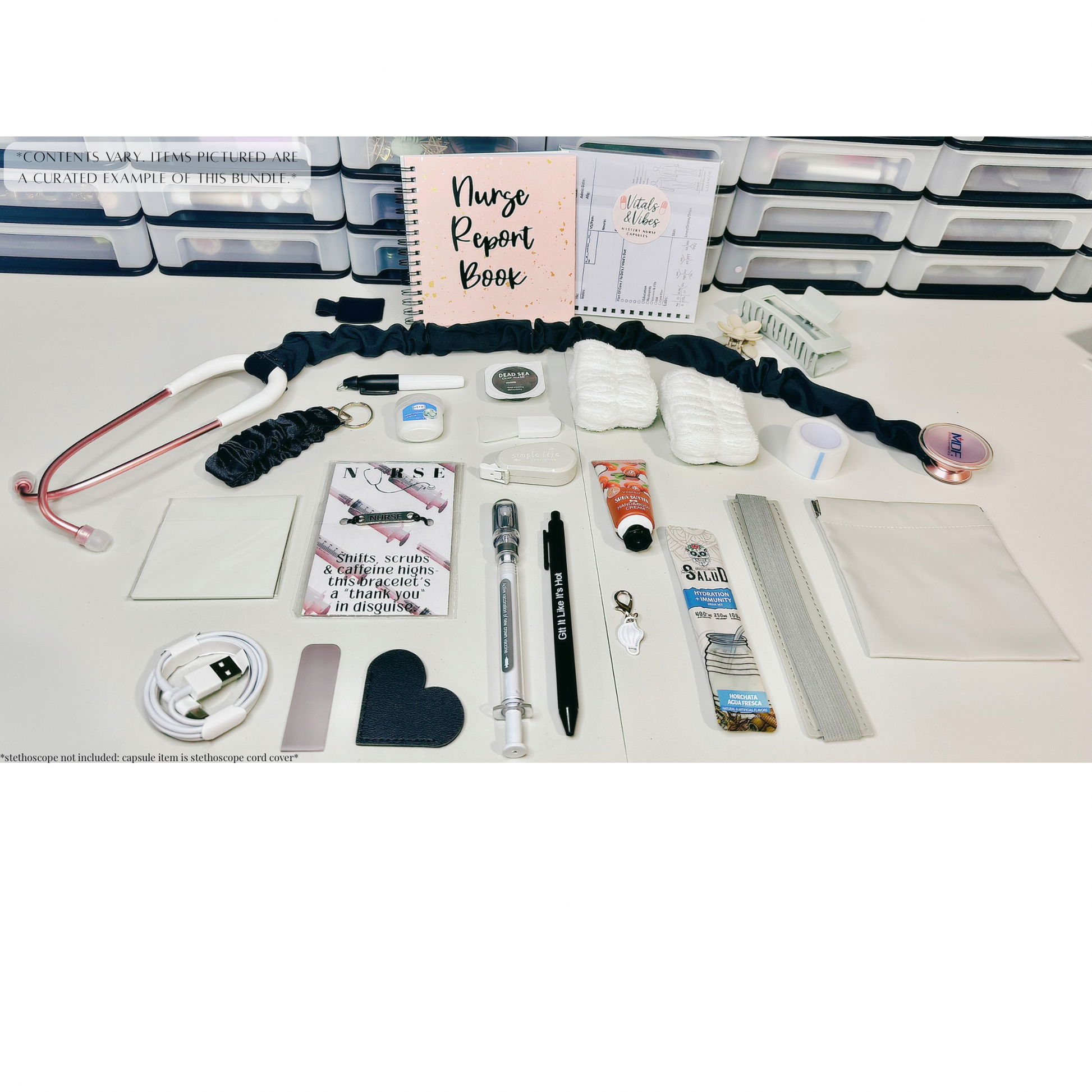 20 capsule scoop, curated to elevate your shift. A perfect balance of must-haves, self-care, and smiles, all wrapped up in one shift-changing box.
